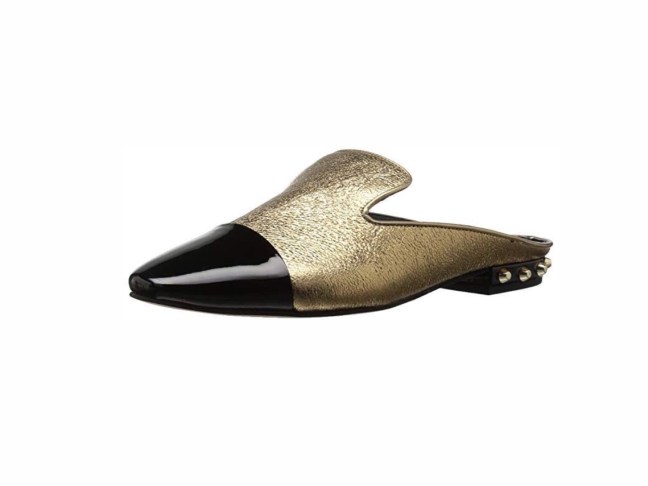 These are the Marc Fisher Analise4 loafer or mule I should say, in gold with black captoe and gold studs at the heel which make them very attractive and unique.
